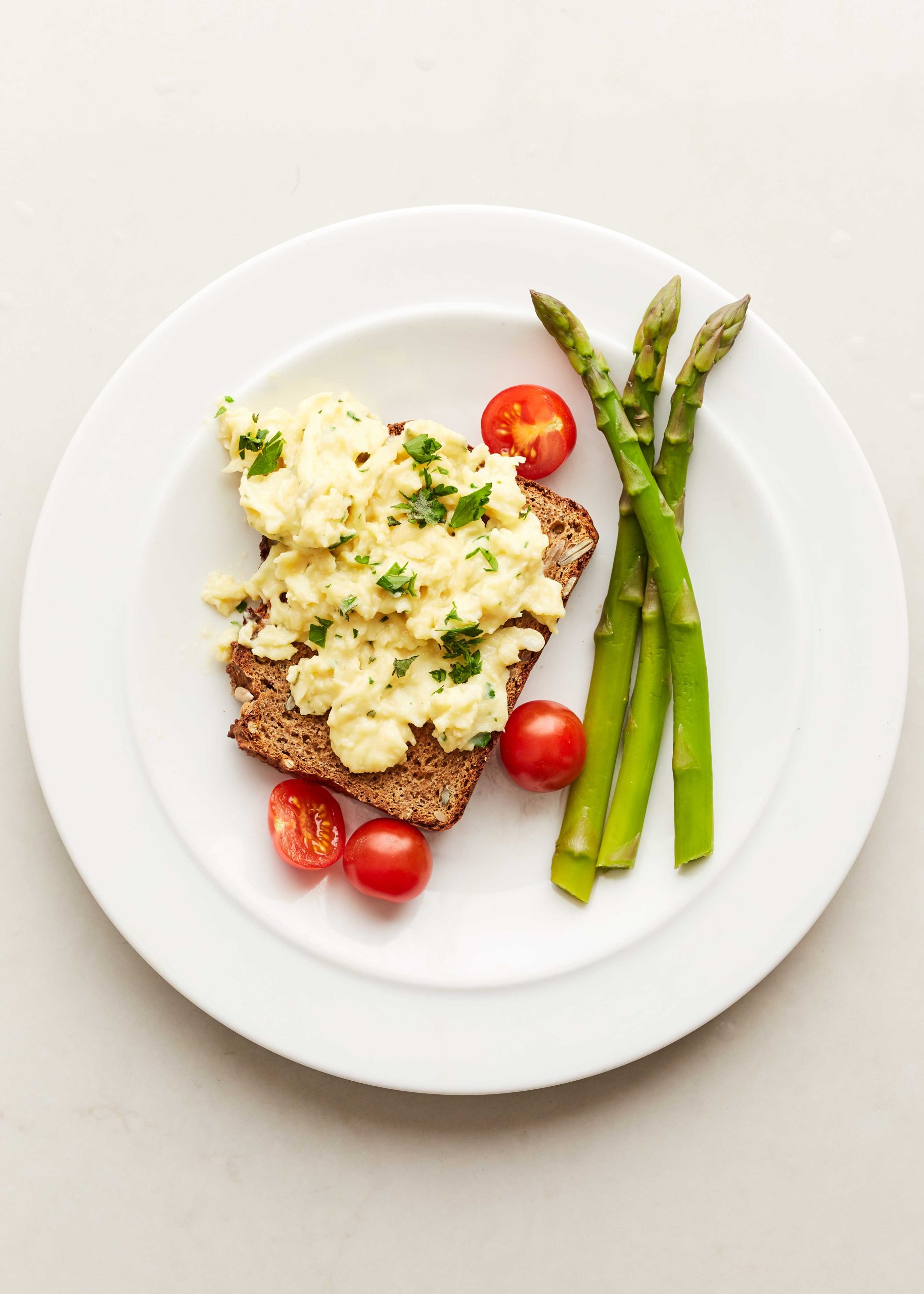 6. Remove from the heat and serve piled on to the asparagus and slices of the multi-seeded bread drizzled with a little olive oil if needed. Top with a few shavings of parmesan.